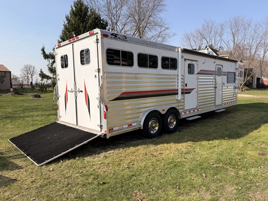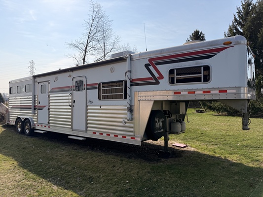 *2003 FSR Aluminum 3-Horse Gooseneck Trailer – Fully equipped with living quarters, bathroom, kitchen, A/C, generator, hot water heater, and tack storage. Ready for shows or travel.